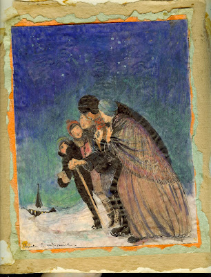 “Early Mass,” by Benita (McGinnis) McCormick. Pen and ink over watercolor on parchment. Milwaukee, Wisconsin; Christmas 1922. Original in Benita’s scrapbook. |